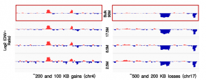 紅色代表拷貝數(shù)增加(左圖),而藍(lán)色代表丟失(右圖).