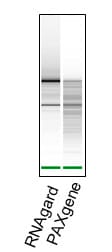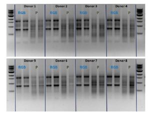 圖3.環(huán)境溫度儲(chǔ)存14天后RNAgard血管(RGB)與競爭對(duì)手P(P)的多個(gè)供體比較。在1.2%瓊脂糖凝膠上觀察200ng RNA。BioMaxi血液RNA純化試劑盒用于從RNAgard血液管中分離RNA。