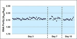 圖4.使用RNAgard血液系統(tǒng)獲得的RNA純度具有高度可重復(fù)性。從8名健康供體收集血液。在樣品儲(chǔ)存3,7或15天后,從一式兩份樣品中純化RNA。通過UV分光光度法(A260 / A280)測定每個(gè)單獨(dú)樣品的RNA純度。在第3天,通過3個(gè)不同的操作員純化每個(gè)供體的重復(fù)樣品,顯示我們系統(tǒng)的可重復(fù)性。