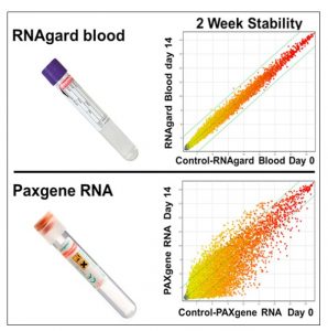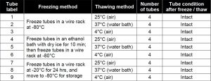 表1.冷凍保存7天后RNAgard血管保持完整。從兩個(gè)健康供體收集血液到RNAgard血液管中。然后將管在室溫下保持至少2小時(shí),然后冷凍。測試了四種不同的冷凍方法,并將管冷凍保存7天。使用三種不同方法解凍管。沒有觀察到管損壞(裂縫,裂縫等)。