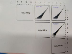 C:不同建庫起始量相關(guān)性高。分別使用1ug、500ng、100ng起始量進(jìn)行建庫測序,不同起始量的結(jié)果皮爾遜相關(guān)系數(shù)R2均超過0.978