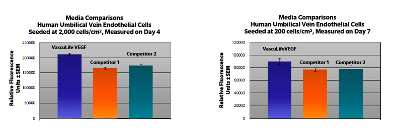 ISO-style標(biāo)準(zhǔn)測(cè)試表明 VascuLife VEGF培養(yǎng)基生長(zhǎng)HUVEC和其他人類大血管內(nèi)皮細(xì)胞,其生長(zhǎng)速率達(dá)到或超過其他商業(yè)上可用的含血清培養(yǎng)基,同時(shí)保持良好的細(xì)胞形態(tài)。與其他商業(yè)上可用的培養(yǎng)基相比,VascuLife VEGF在不同的播種密度下表現(xiàn)出更好的增殖能力。