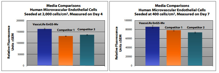 VascuLife?Engs-MV培養(yǎng)基在不添加人VEGF的情況下培養(yǎng)人微血管內(nèi)皮細胞,在保持良好細胞形態(tài)的同時達到或超過其他商業(yè)上用含血清培養(yǎng)基的速度。與其他商業(yè)媒體相比較,VascuLife? 在不同的播種密度下表現(xiàn)出更好的增殖能力。