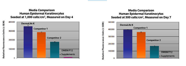 人表皮角質(zhì)形成細胞和口腔角質(zhì)形成細胞的體外培養(yǎng)15次人口倍增在滿足或超過其他商業(yè)上可用的無血清培養(yǎng)基的同時保持良好的細胞形態(tài)。與其他商業(yè)化培養(yǎng)基相比,表皮角質(zhì)形成細胞在不同的播種密度下表現(xiàn)出更好的增殖能力。