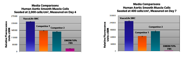 VascuLife?SMC培養(yǎng)基通過至少15個群體倍體培養(yǎng)人平滑肌細胞,達到或超過其他商用含血清培養(yǎng)基,同時保持良好的細胞形態(tài)。與其他商業(yè)媒體相比較,VascuLife?在不同的播種密度下表現(xiàn)出較好的增殖能力。