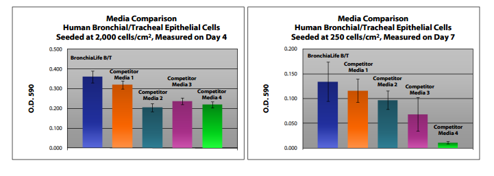 BronchiaLife?培養(yǎng)基通過至少15次群體倍增生長人類支氣管/氣管上皮細(xì)胞,小氣道上皮細(xì)胞和Lobar支氣管上皮細(xì)胞,達(dá)到或超過其他在售培養(yǎng)基,同時保持優(yōu)異的細(xì)胞形態(tài)。與其他在售培養(yǎng)基相比,BronchiaLife?在不同的接種密度下表現(xiàn)出優(yōu)異的增殖。