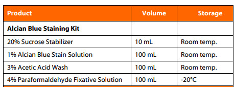 生命線?愛茜藍染色試劑盒包含:固定溶液,蔗糖穩(wěn)定劑溶液,愛茜藍染色溶液和乙酸洗滌溶液用于染色由軟骨細胞沉積的硫酸化蛋白聚糖。