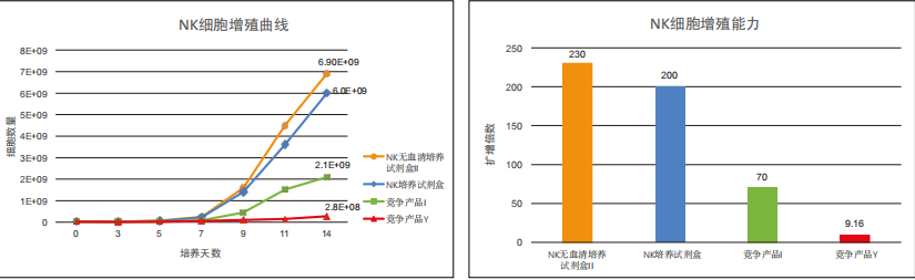 對于NK細胞的增殖,如圖2和圖3所示,NK細胞在分別利用NK無血清培養(yǎng)試劑盒II和NK培養(yǎng)試劑盒培養(yǎng)14天后擴增了230倍和200倍,總細胞數(shù)量分別為7 x 109個細胞和 6 x 109個細胞,比競爭產(chǎn)品I的培養(yǎng)試劑盒(只達到70倍的擴增)多了3倍。利用競爭產(chǎn)品Y的培養(yǎng)試劑盒培養(yǎng)的NK細胞呈比較差的擴增表現(xiàn),這也與其細胞形態(tài)學觀察結果一致。