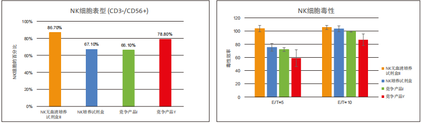康寧NK無血清培養(yǎng)試劑盒II具有一套完整的材料和詳細的操作程序。與競爭產(chǎn)品I和競爭產(chǎn)品Y的培養(yǎng)試劑盒相比,培養(yǎng)于康寧NK無血清培養(yǎng)試劑盒II的NK細胞在生長、NK陽性細胞比率以及細胞毒性效力方面均表現(xiàn)出了更好的性能。