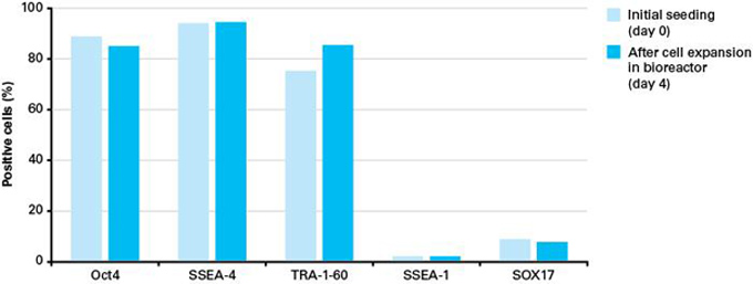 使用Cellartis DEF-CS 500無xeno三維球形培養(yǎng)基在攪拌槽生物反應器中(灌注模式)培養(yǎng)高質量的hiPS細胞聚集體。將hiPS細胞擴增成聚集體后,于第4天收獲細胞,通過免疫染色分析OCT4、SSEA-4、TRA-1-60(多能性標志物)和SSEA-1、SOX17(分化標志物)的表達