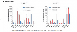 細(xì)胞因子檢測(cè)結(jié)果顯示,與商業(yè)外周血血清(GemCell)相比,臍帶血血清在多種生 長(zhǎng)因子和趨化因子上的濃度均更高。